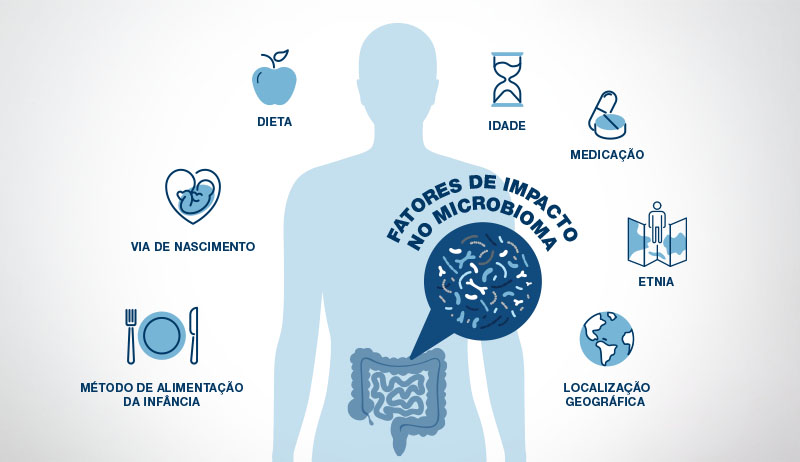 Diversos fatores, como a dieta, agentes antimicrobianos e imunidade, influenciam os microbiomas humanos, especialmente o microbioma intestinal, que abriga a maior quantidade e variedade de microrganismos. Em resposta, os produtos bioativos proveniente do microbioma moldam a função das células humanas (2, 21).